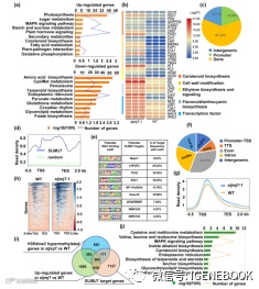 值得注意的是,结合全基因组转录、结合位点和组蛋白修饰谱分析,作者发现DML2(一个关键的DNA去甲基化酶基因)是SlJMJ7的直接靶点,这暗含着组蛋白去甲基化和DNA去甲基化之间可能存在一定的关系。为了证实这一推测,作者评估了WT和SlJMJ7突变体果实中DML2位点H3K4me3水平的动态变化,发现SlJMJ7突变体中DML2位点的H3K4me3水平显著升高,表明SlJMJ7在果实成熟初期通过H3K4me3去甲基化直接和特异性地抑制DML2的表达。随后,作者对野生型和SlJMJ7突变体进行了全基因组甲基化测序(WGBS),并联合DML2突变体的DNA甲基化谱进行了分析,发现SlJMJ7能够通过DML2调控的DNA甲基化来间接抑制与成熟相关的基因如RIN、NOR等在番茄果实中的表达。