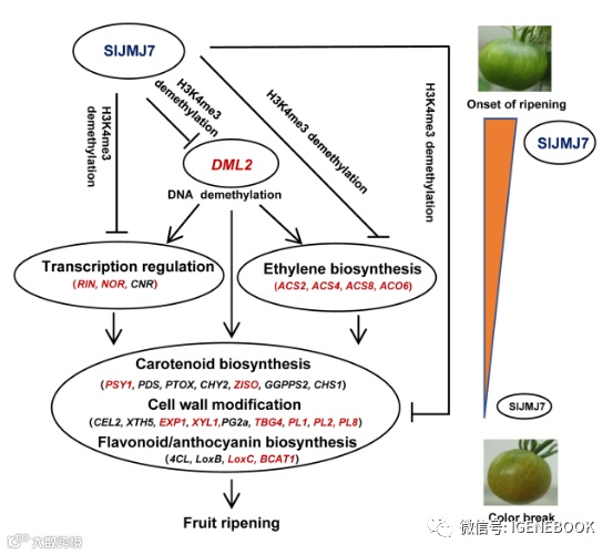 综上所述,作者构建了SlJMJ7调控番茄成熟的工作模型。简单来说,SlJMJ7能够通过直接调控H3K4me3,以及通过抑制DNA去甲基化酶DML2的表达来间接抑制DNA甲基化的方式,达到抑制与乙烯合成和成熟相关的基因表达的目的。这些发现揭示了组蛋白H3K4甲基化和DNA甲基化互作调控植物发育过程中基因表达的新机制。