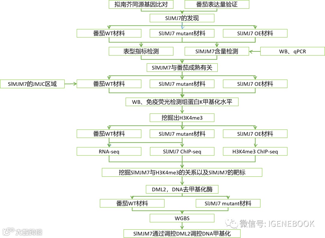 中国科学院华南植物园段学武课题组长期致力于园艺作物采后生物学、生物化学与分子生物学和贮运保鲜技术的研究工作。项目组在前期研究发现,SlJMJ7这个基因在番茄果实成熟早期高表达,表明该基因在成熟的过程中可能起到比较重要的作用;此外,这个基因具有组蛋白H3K4脱甲基酶活性。作者推测SlJMJ7介导的组蛋白H3K4去甲基化参与了番茄果实成熟的调控。因此,作者从表观遗传学的角度,结合WGBS、ChIP-seq、RNA-seq等多种技术揭示了SlJMJ7在果实成熟过程中的功能和作用机制。