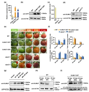 首先,作者构建了SlJMJ7的过表达和敲除体系,通过番茄果实表型检测(SlJMJ7过表达株系表现出果实成熟延迟的表型,而SlJMJ7功能丧失则加速了果实成熟)和SlJMJ7表达谱揭示了SlJMJ7在番茄果实成熟过程中发挥着抑制因子的作用。