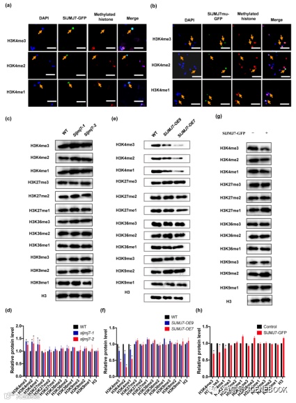 随后,作者对SlJMJ7的结构进行了研究,发现SlJMJ7含有一个JmjC结构域,而这个结构域具有组蛋白去甲基化功能,因此作者试图研究SlJMJ7的组蛋白去甲基化酶特性。通过in vivo和in vitro对各种组蛋白赖氨酸甲基化标记的信号强度进行检测分析发现,H3K4的甲基化受SlJMJ7影响最大,SlJMJ7具有特异性H3K4me1/2/3去甲基化酶活性。