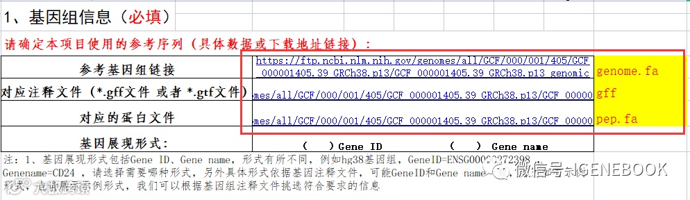 在爱基百客的信息分析表附录中,会包含部分物种是我们已经收录的,如包含老师想研究的物种及对应版本,可直接将附录中的链接复制粘贴进信息分析表的表格中。若没有老师想研究的物种及基因组版本,或老师有额外想要提供的其他参考基因组信息时,为避免产生因后续多次沟通基因组信息从而拉长生信分析周期等问题,请务必粘贴正确的“genome.fa;genome.gff以及pep.fa”文件的下载链接。