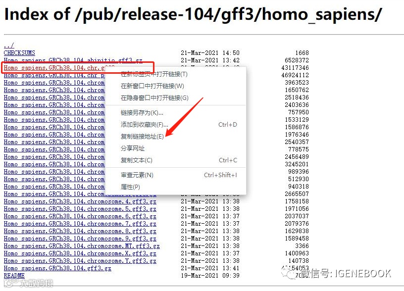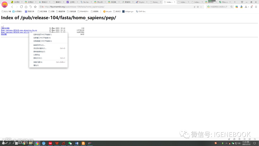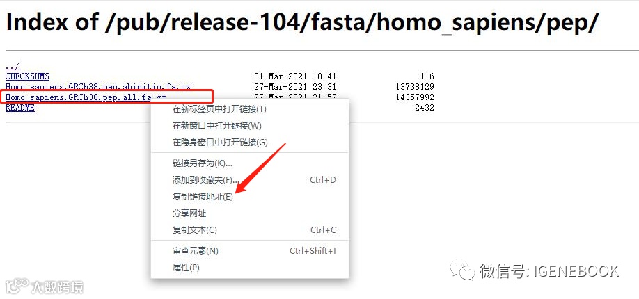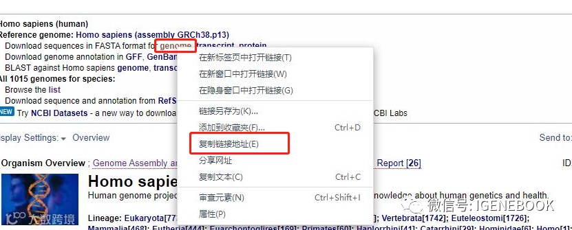4、请将对应文件的下载链接填写在表格中,,以“genome”为例,右键“genome”,在小窗中选择“复制链接地址”。此时下载链接已复制,随后将复制好的链接粘贴进表格内即可。