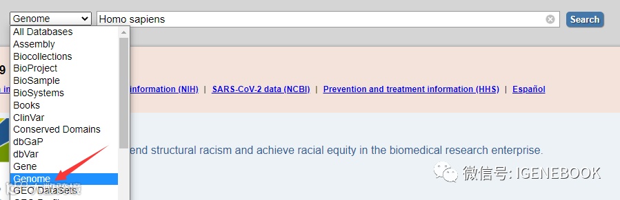 1、打开NCBI,在搜索栏输入homo Sapiens(或human,优先选拉丁名),Database选择genome,点击search。