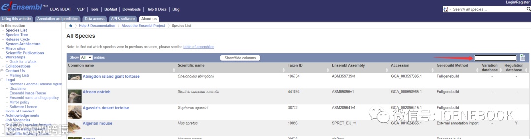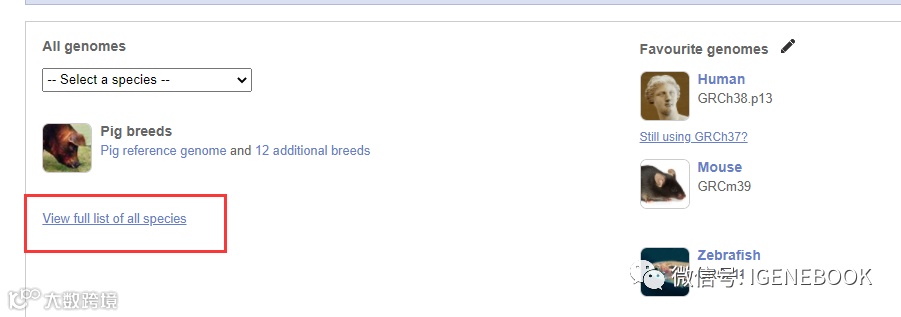 2、若ensembl数据库中有收录我们要查找的物种基因组,点击view full list of all Ensembl species,我们可以在list中找到我们关注的物种。