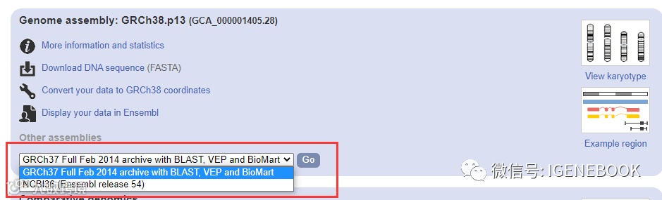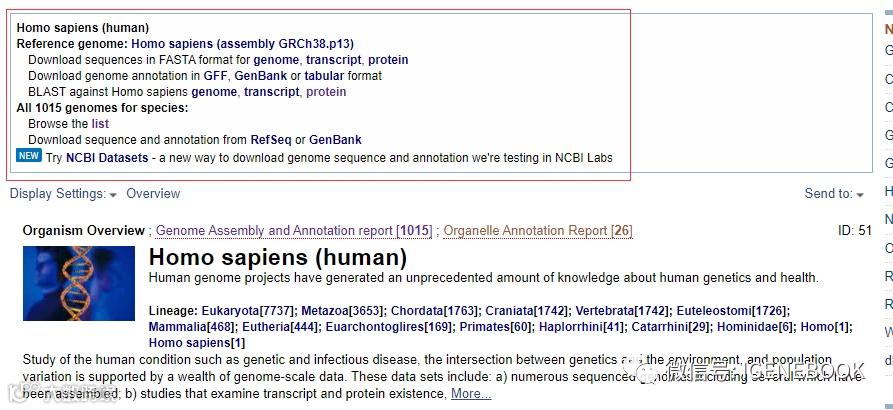 4、很多物种拥有不止一个基因组版本,不同基因组版本可能来源于不同的基因组项目,或对应不同的亚种,进入相应物种页面之后,我们可以进入到不同的基因组链接中进行查看,例如人不同株系的细胞,也是需要在该位置点击株系列表浏览。