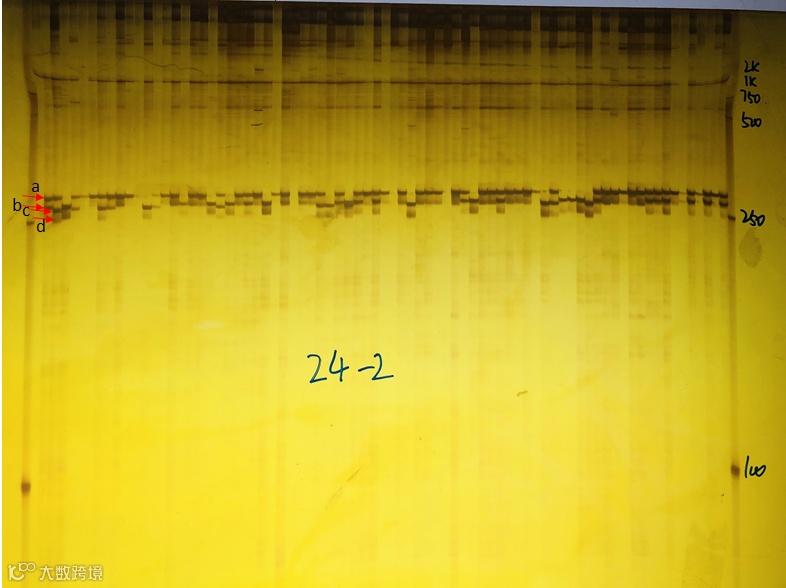选择一段区域进行结果统计,一般如果样本为纯合样本,则单个样本只有一条主带,如果为杂合样本,会产生多条带。在选择的区域,通过观察确认电泳图上的条带数量(如图上红色箭头标识),并用字母分别标识不同的条带(如上图标识的a、b、c和d)。然后在Excel表格中统计相应引物对应的样本的条带,有对应条带则记录为1,无相应条带,则记录为0。