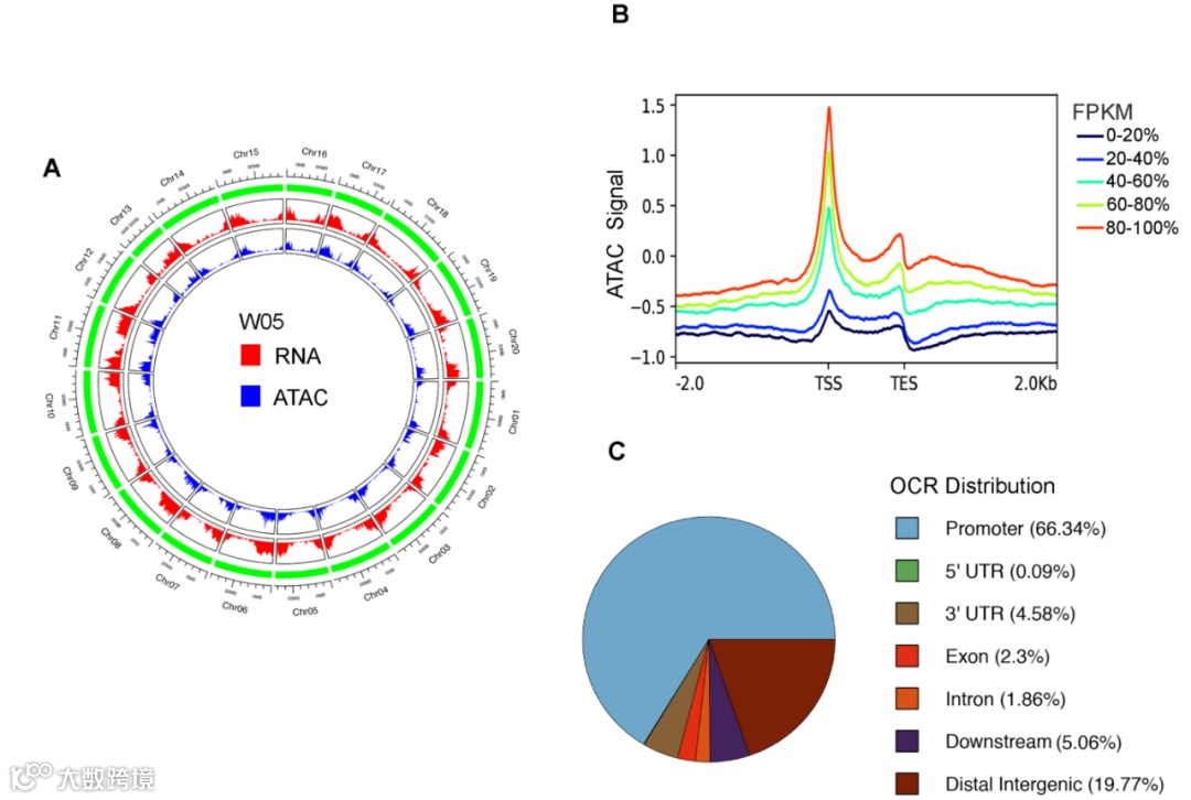 采用 ATAC-seq 对 W05 野生大豆品种中的 OCRs 进行全基因组表征。正如预期的那样,发现 ATAC-seq 信号主要在基因转录起始位点 (TSS) 处富集,并且信号强度与标记基因的表达水平呈正相关,表明开放染色质状态与基因激活有关(图 1A、B)。此外,使用 Genrich 软件确定了 ATAC-seq 中的 22,333 个富集区域,并定义为 OCRs与 15,588 个蛋白质编码基因相关。对OCRs 的注释, 结果表明,大多数 OCRs 位于启动子(66.34%)和远端基因间(19.77%)区域,其余位于下游 (5.06%)、3’UTR(4.58%)、外显子 (2.3%)、内含子 (1.86%) 和 5’UTR (0.09%)(图 1C)。