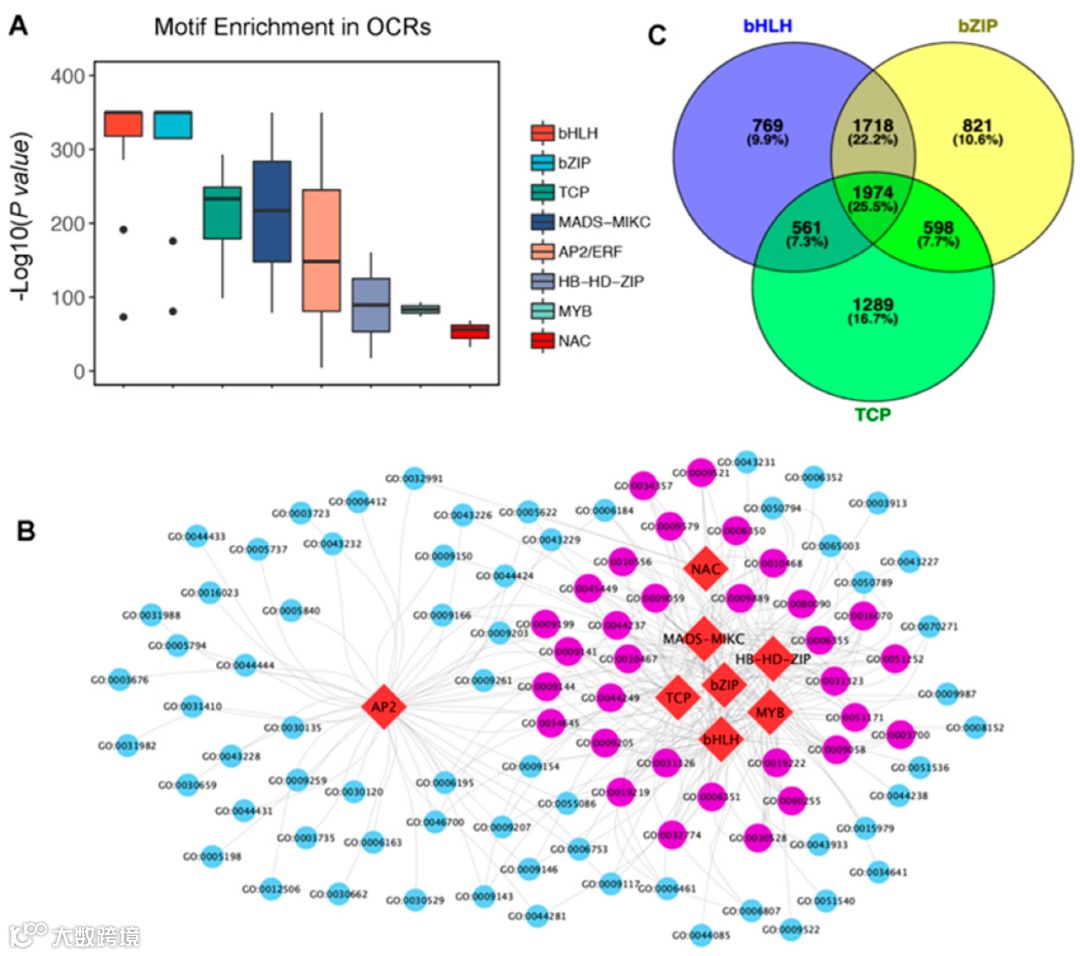 染色质结构的松弛使转录因子 (TF) 的结合能够激活基因表达,因此 OCRs 通常具有保守的 TF 结合基序。为了评估有哪些保守TF的结合基序在OCRs中富集,作者利用PlantPAN3.0数据库去比对分析,结果发现有48.9%(70/143)的TF结合基序在OCRs中显著富集,其中 bHLH、bZIP、TCP、MADS、AP2/ERF、HD- ZIP、MYB 和 NAC 这八个是最显着丰富的基序(图 2A)。此外,使用富集的 TF 结合基序以及基因本体论 (GO)中OCR 相关的下游基因,在 W05 叶中构建了一个潜在的 TF 调控网络(图 2B)。大约 33 个 GO(图 2B)被这七个 TF 家族紧密地共同调控。另一方面,AP2/ERF 家族调节下游子集,与上述七个 TF 家族重叠较少(图 2B),表明 AP2/ERF 可能调节一组独特的途径。此外,发现 1974 个基因(所有 OCRs 相关基因的 25.5%)被前三的富集基序家族bHLH、bZIP 和 TCP共同靶向。这些结果表明多个 TF 可能在 OCRs中协同调节下游基因激活。