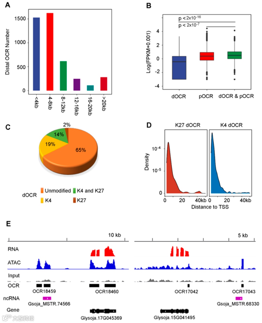 远端 OCRs (dOCRs) 已被广泛用于预测植物中假定的增强子。在这项研究中,作者发现 4405 个 OCRs 位于启动子上游2kb区域,将这些 OCRs 定义为 dOCRs,其中 1529 和 1624 分别位于最近基因转录起始位点 (TSS) 上游的 2-4 和 4-8 kb 区域。dOCR (W05_OCR09684) 和最近基因的 TSS 之间的最长距离高达 300 kb(图 4A)。据观察,与 dOCRs 和启动子 OCRs (pOCRs) 相关的基因往往比仅与 dOCRs 或 pOCRs 相关的基因具有更高的表达(图 4B),表明这些 dOCRs 可能作为基因表达的推定增强子。与 pOCRs 相比,大多数 dOCRs (65%) 具有较少的 H3K4me3 或 H3K27me3 修饰(图 4C)。dOCRs 的 H3K4 和 H3K27 组蛋白修饰在 TSS 上游 10 kb 区域内的分布(图 4D)表明,随着与 TSS 距离的增加,dOCRs 的染色质状态逐渐转变为未修饰状态,类似于在其他植物中观察到的情况。此外,增强子有时与编码LincRNAs的基因组相关联,这种通常被认为是转录增强RNAs(eRNAs)。与栽培大豆相似,W05中的小部分(3.6%)dOCRs与报道的LincRNA基因组重叠,表明这些dOCRs可以作为推定的增强子。