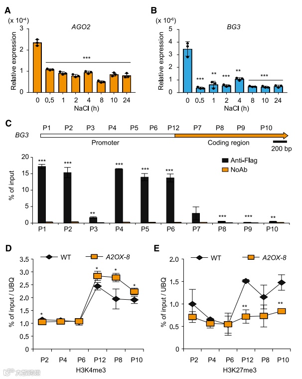 检验盐胁迫下AGO2和BG3的表达情况发现它们的表达受到盐胁迫强烈抑制,然而在A2OX过表达植株中,BG3的表达受盐胁迫强烈抑制,而AGO2仍然过量表达,表明BG3在盐胁迫下的表达可能部分独立于AGO2。将AGO2-Flag植株进行ChIP-seq(anti-flag)分析,发现AGO2富集结合BG3。ChIP-qPCR验证富集结果发现AGO2不仅富集BG3启动子区域富集,也在一定程度上富集BG3的基因编码区。