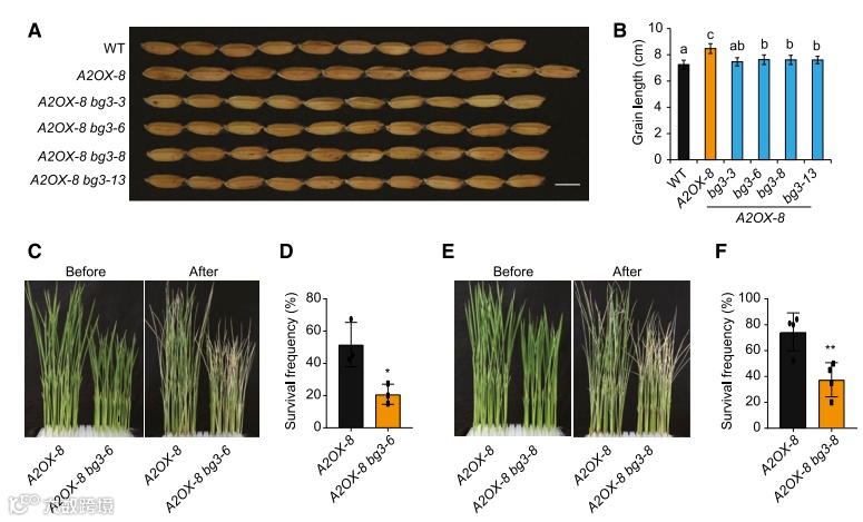 将A2OX-8株的BG3进行基因敲除,发现这些BG3敲除系的植株明显在谷粒长度和植株高度都降低。并且这些植株在耐盐方面比A2OX-8较低,但是相对于野生型,还是表现出一定的耐盐和较长的谷粒长度。这些结果表明,BG3参与AGO2提高谷粒长度和耐盐性。