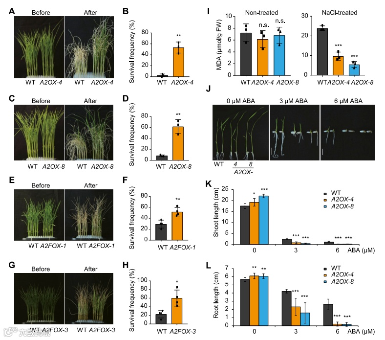 不同的株系在盐胁迫下(200 mM NaCl)下,表现出不同的生长状况,A2FOX材料和A2OX表现出一定的耐盐性,而野生型在盐胁迫下几乎不能生长。检测盐胁迫下的脂代谢产物丙二醛(MDA)。结果显示A2OX材料的MDA水平比野生型更低。检测ABA水平发现ABA敏感性在A2OX材料的嫩芽和根中更敏感。