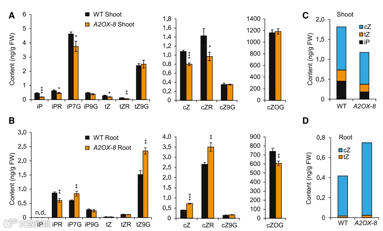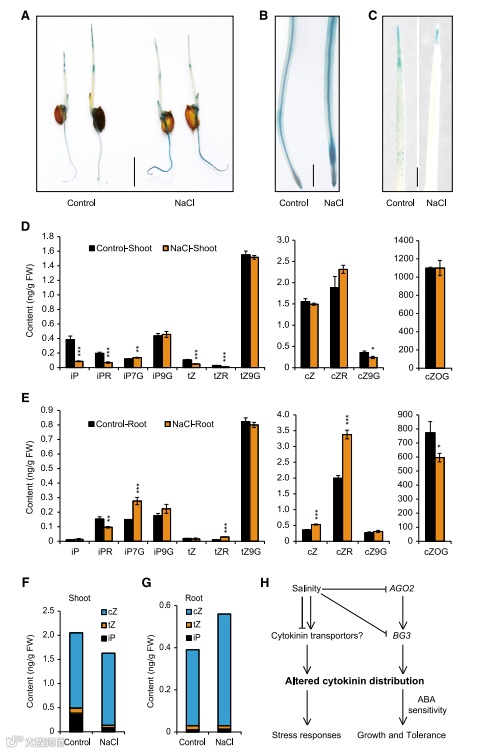 文献报道BG3表达一个假定的细胞分裂素转运体来促进细胞分裂素从茎到根的运输,作者检测了A2OX植株和野生型植株中的茎和根的不同细胞分裂素的含量。在茎秆中,iP、tZ和cZ以及几种它们的复合体的含量在A2OX中相对野生型来说显著性降低。在根中,这些细胞分裂素部分反而显著性升高:iP在野生型和A2OX都未检测到;tZ水平变化不明显;不同的cZ检测到并且在A2OX中比野生型更高;iPR和o-葡萄糖苷cZ在A2OX中减少;葡萄糖苷iPR7、葡萄糖苷tZ9和cZR水平在A2OX中显著性增高。当检测细胞分裂素三种主要活性形式的组合水平时,作者观察到A2OX幼苗的细胞分裂素水平明显降低,但与野生型相比,根的细胞分裂素水平相应增加。这些结果进一步印证AGO2启动BG3表达并且改变细胞分裂素在植物中的分布,进而调控谷粒大小和植株胁迫应答。有趣的是,BG3只在A2OX植株的嫩芽中激活而不是根中激活表明这种调控方式是组织特异性的,这也能解释为什么细胞分裂素的分布情况在A2OX和bg3-D种不一样。