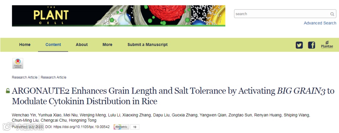ARGONAUTE (AGO)蛋白与小的RNA活性相关,主要通过形成RNA介导的沉默复合物导致基因沉默。这些复合物通过多种机制抑制基因表达,如RNA切割、翻译抑制和以一种small RNA和AGO依赖的方式的DNA甲基化,除此之外,在拟南芥中,AGO1能与染色质结合,作为转录的转录激活子。本文介绍了AGO蛋白在盐胁迫下调控水稻的一种新机制。文章标题为ARGONAUTE2 Enhances Grain Length and Salt Tolerance by Activating BIG GRAIN3 to Modulate Cytokinin Distribution in Rice,2020年7月发表在Plant cell上一篇文章,影响因子8.538.