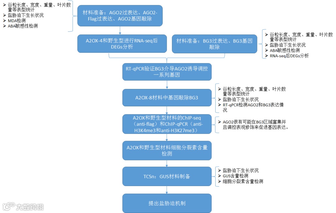 使用A2OX-4材料和野生型材料进行RNA-seq测序,测序后的结果进行差异分析,发现相对于野生型,A2OX-4材料中有1514个基因上调、584个基因下调。这样的结果表明A2OX过表达能增强基因表达。进一步GO差异基因,发现这些基因显著性富集在盐胁迫进程如胁迫应答和氧压应答。在一系列激活表达的基因中,发现BG3也被激活。BG3被报道能调控谷粒的大小。RT-qPCR证实BG3确实在A2OX材料中激活表达。而BG3过表达材料BG3OX和BG3突变株bg3-D材料的谷粒大小和叶片都有增加。选取4个A2OX-4中差异表达的基因在A2OX和BG3OX材料中进行验证发现这些基因也是表达增加的。进一步BG3-D材料的RNA-seq的差异表达分析显示bg3-D中55.9%(301/538)的差异基因在A2OX也差异表达,其中93.3%(279/301)在BG3和AGO2中都表达上调。这些都表明BG3介导AGO2诱导调控一系列基因。