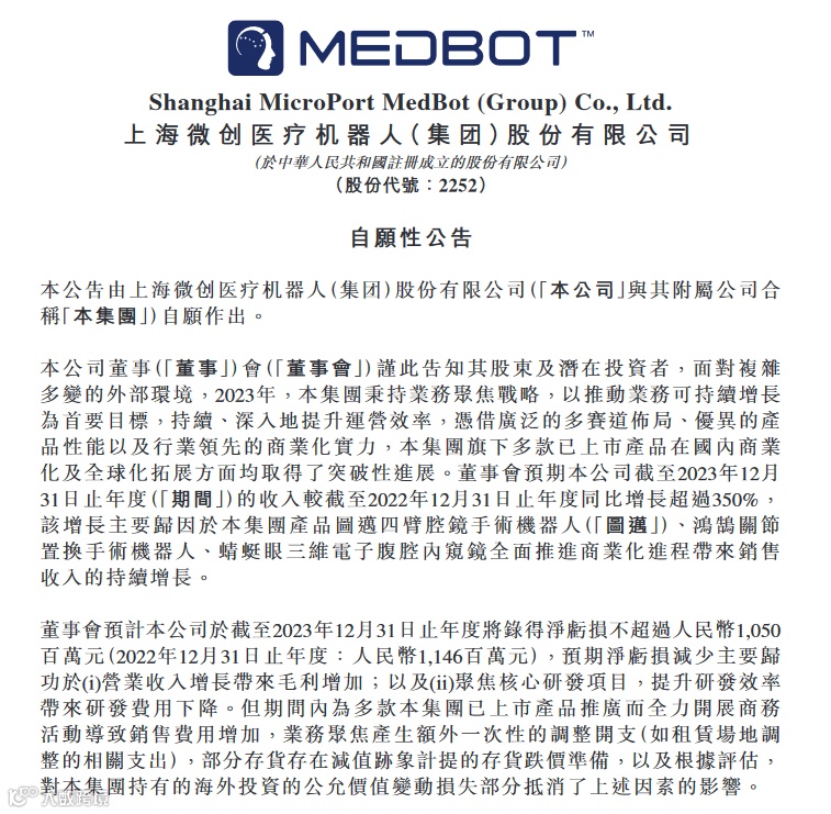 2024年3月5日,上海微创医疗机器人(集团)股份有限公司发布自愿性公告。董事会预期公司截至2023年12月31日止年度(期间)的收入,较截至2022年12月31日止年度同比增长超过350%(据MedRobot查询和计算,2022年营收2342万元,预计2023年营收超过1.05亿元)。