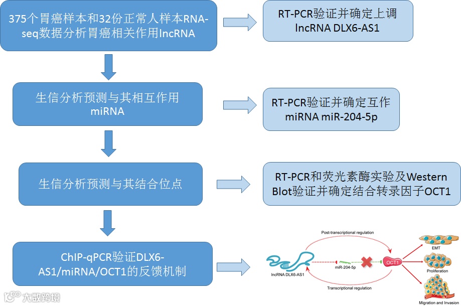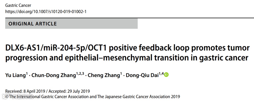 大多数lncRNA都是通过RNA聚合酶II转录的,如PolII占用、50caps、与PolII转录延长相关的组蛋白修饰和聚腺苷酸化。已报道了很多关于lncRNA在肿瘤发生中发挥作用的反馈机制如PVT1/miR-30d-5p/RUNX2;PVT1/miR-455/RUNX2;CACS19/miR-140-5p/CEM2P等。本文就2019年在Gastric Cancer上发表的文章DLX6‑AS1/miR‑204‑5p/OCT1 positive feedback loop promotes tumor progression and epithelial–mesenchymal transition in gastric cancer来探讨关于lncRNA和miRNA以及转录因子之间在肿瘤中的反馈机制。