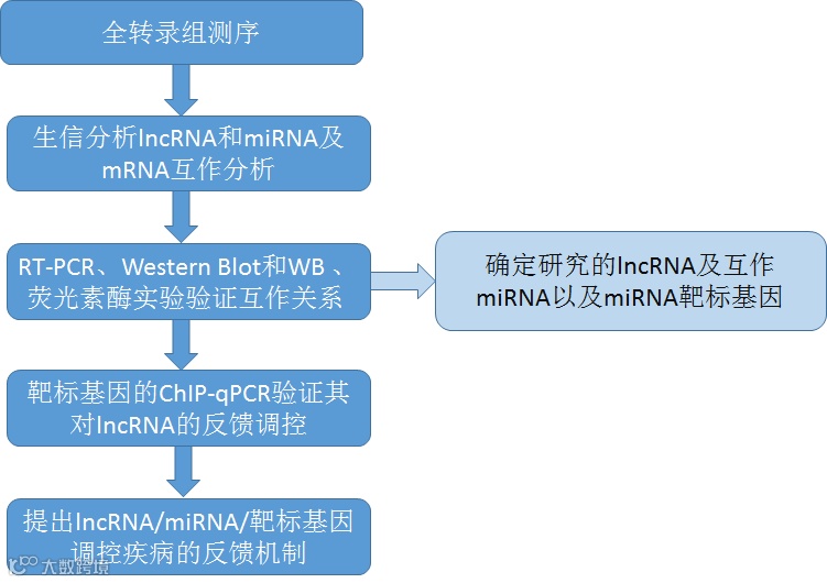 当然,作者很多的实验结果借助了数据库,比如375份胃癌样本和32份正常样本的RNA-seq数据来源于TCGA数据库,miRNA预测借助了miRcode和 DIANA-LncBase数据库,靶标基因借助了JASPAR。若是不懂得生信分析知识也没有关系,现在全转录组分析能够将测得的全部转录组信息进行整合分析,得到样本中各种lncRNA-miRNA-mRNA互作示意图,然后再将得到的互作关系进行验证,实验流程示意图如下:
