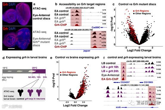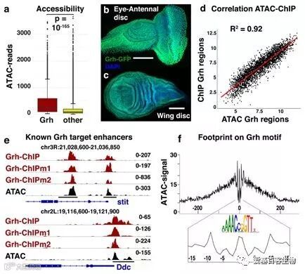 为了验证Grh实际上是否与前面预测的Grh结合位点结合,对Grh-GFP进行了ChIP分析,并且还重新分析了公布的Grh ChIP-seq数据。与染色质可及性一致变化的相同Grh基序(图1c,d)是Grh-ChIP峰中显著富集的。有趣的是,3246个Grh靶区域的ChIP-seq信号与ATAC-seq信号显著相关(P=0.92)。