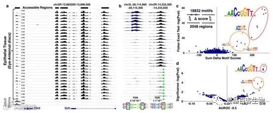 为了探究在特定组织中建立染色质可及性所必需的DNA特征,对23中不同品系的近交果蝇上皮组织的眼 - 触角形成盘组织进行了30个样品的ATAC-seq,发现样品间开放染色质谱高度相似(P= 0.76-0.96)但又与成人大脑等非上皮组织的开放染色质谱有显着差异(P=0.25-0.5),在30个样品的实验中,鉴定到了30774个染色质可接近区域,并将染色质可接近区域与该区域内的297000个SNP位点进行关联,鉴定了4289(~1.5%)SNP其与周围区域的可接近性变化显着相关(FDR <0.05)与其(图1b),称为染色质可接近性QTL(caQTLs)。