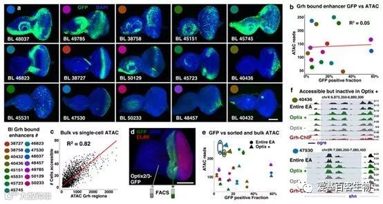 为了测试Grh是否与增强子结合而不激活它们,测量了另外21种Grh靶增强子的报告活性,其中15种在眼-触角形成盘中显示出活性。有趣的是,这些Grh结合增强子的可及性与GFP报告基因活跃的细胞数之间没有相关性(= 0.05)(图4b)。此外,使用单细胞ATAC-seq,发现可获得Grh结合增强子的单个细胞的实际数量与它们的大量ATAC-seq信号相关(P= 0.82,图4c,补充图2) )。这些结果已经表明Grh绑定打开了它的目标增强子,而不必激活它们。