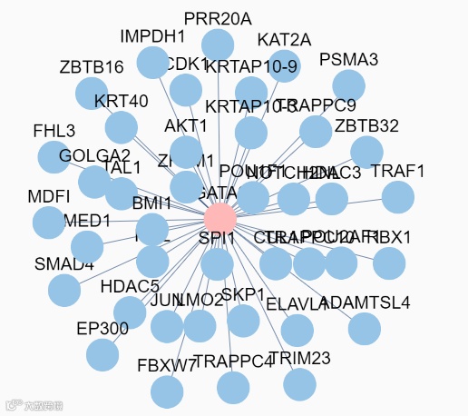 在得到目标的转录因子之后,可以根据转录因子motif网站 http://jaspar.genereg.net/ 提供的motif序列,利用homer[2]软件对目标序列(peak或者Promoter区域的序列)进行motif分析,得到目标区域的已知转录因子motif。然后根据peak或promoter关联的基因及其注释筛选出motif结合基因,对这些基因用clusterprofiler 软件做GO富集分析,最后利用Cytoscape做成网络互作图。示例结果如下: