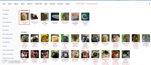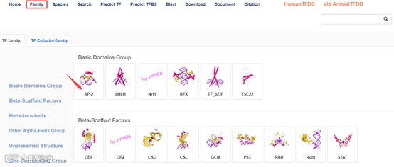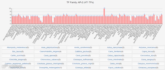 还有另外一个方法,点击进入Family主页面,页面展示的是不同分类的家族TF信息。找到AP-2家族后点击进入家族页面,页面展示了不同物种的AP-2转录因子信息,点击某个物种即可查询该物种TF信息。