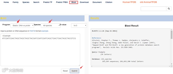 点击Predict TF跳转到TF预测页面。输入fasta格式的蛋白序列文件,基本比对方法预测TF。