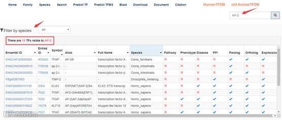 已知某个转录因子名字,以AP-2为例。在主页的右上角有一个搜索框,输入AP-2关键词后点击搜索按钮,即可得到AP-2相关的页面结果信息,结果页面展示了AP-2相关基因的ID、物种和注释信息。可以通过物种筛选按钮,根据物种类别进行筛选。
