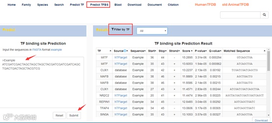 已知一段DNA序列查询其潜在的TF binding site,点击Predict TFBS进入主页面,输入fasta格式的核苷酸序列,点击Submit按钮即可将任务提交给后台运行,结果反馈预测的TF binding site信息。还可以根据TF家族分类进行筛选。