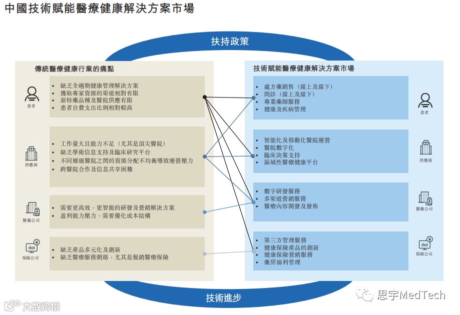 如上图所示,痛点弥漫传统医疗健康行业并影响着生态圈中的所有参与者,也带来了前所未有的机遇,让参与者通过将院内及院外市场,社会及商业健康保险市场与全套服务相结合探索全新的业务模式。