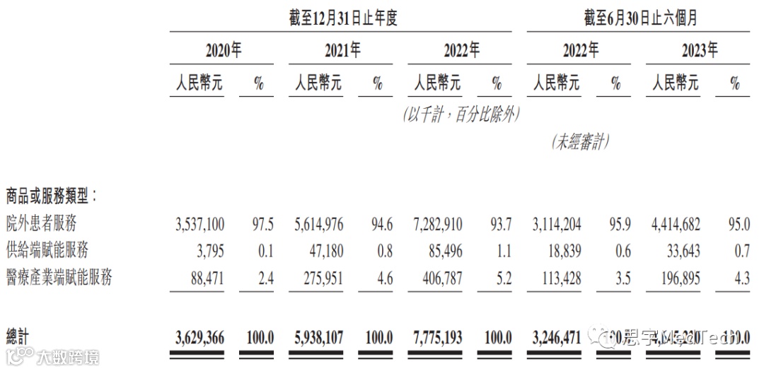 公司主要收入来源为院外患者服务业务,收入规模占比95%左右。2020年至2023年上半年收入明细如下表所示: