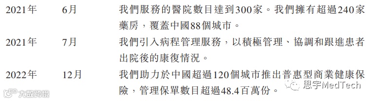 目前,公司通过赋能医药公司和保险公司等其他行业参与者,提供具针对性的解决方案,藉以进一步满足患者对病程管理的需要,在院内就诊,院外医疗交付乃至健康险支付的整个过程陪伴患者。