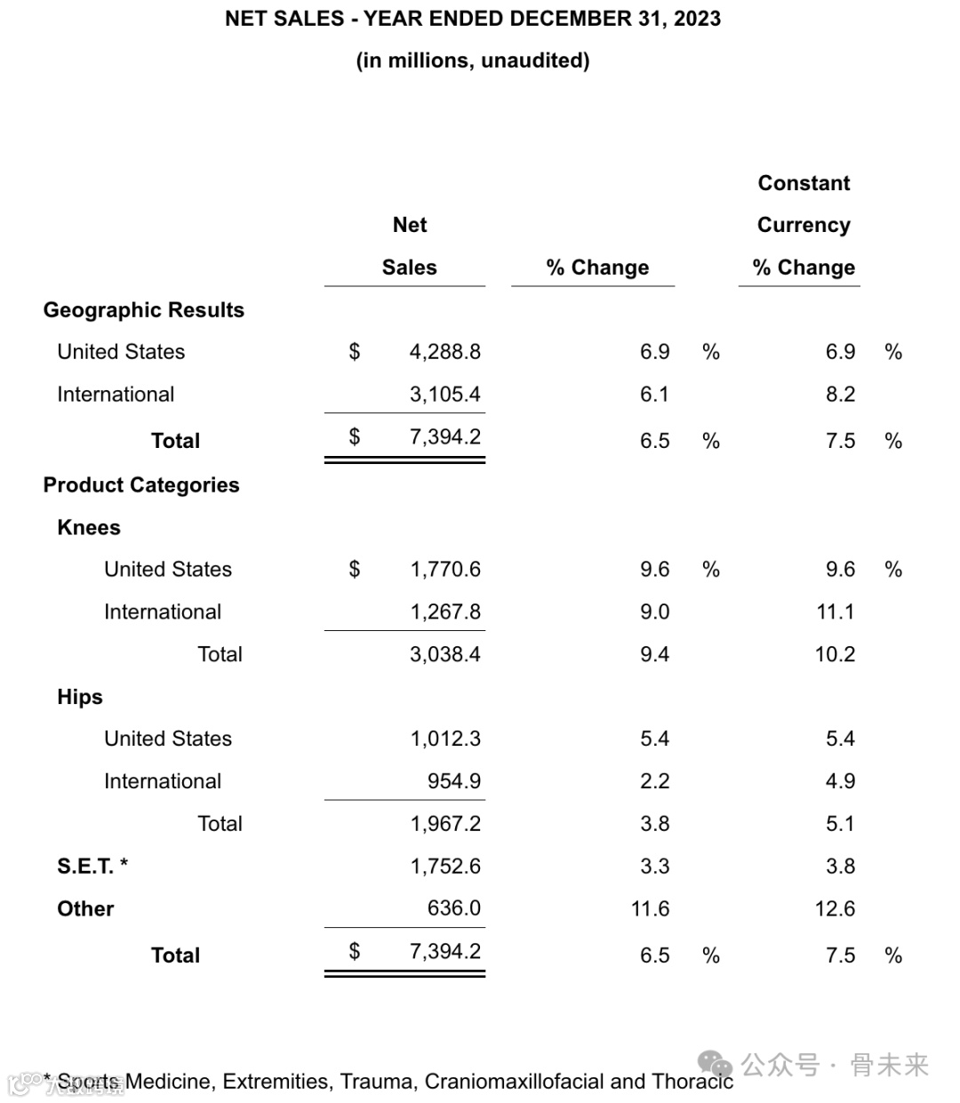 以下销售表展示了,捷迈邦美截至2023年12月31日的第四季度和全年的地区和产品类别销售业绩。此外,还包括与前一年相应数据相比的百分比变化,分别以报告基础和固定汇率基础进行计算。