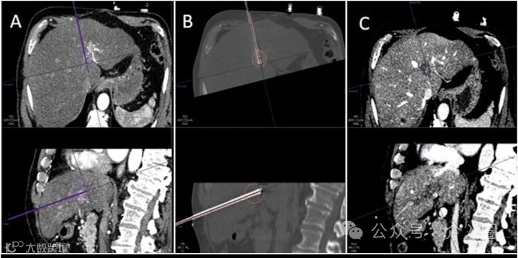术后评估:采取术后CT并叠加术前图像以评估结果,比较肿瘤体积与消融区,以确定手术的效果和患者的恢复情况。