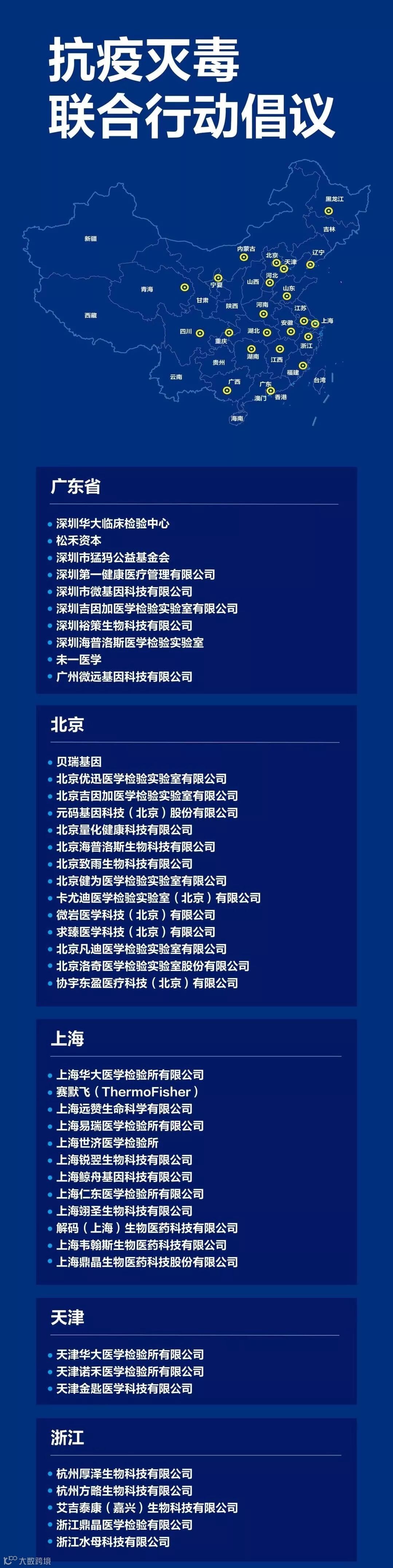 截至目前,已经有52家企业共同倡议,愿意暂停正在进行的部分科研工作和业务运营,为抗疫灭毒提供PCR实验室、基因扩增检验实验室、P2实验室、CAP认证实验室场地几十处,自动化核酸仪、全自动毛细管电泳仪、测序仪、PCR仪器近百台,检测试剂盒以及专业人员若干以及捐资上千万元,覆盖北京、湖北、辽宁、广东、浙江、江西、福建、上海、黑龙江、天津等18个省市区。