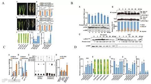 图4 A:IPA1提高植物的稻瘟病菌能力;B:稻瘟病感染后IPA1磷酸化;C:磷酸化IPA1结合WRKY45提高抗病能力;D:163位丝氨酸磷酸化对于抗病能力的提高是必须的