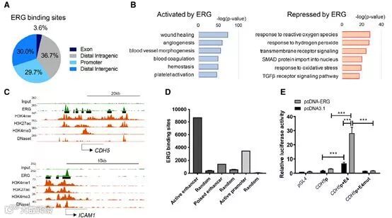 除了上述提到的常规对转录因子研究思路外,也有一些文章从其他角度对转录因子的研究提供了新的思路。The Transcription Factor ERG Regulates Super-Enhancers Associated With an Endothelial-Specific Gene Expression Program文章通过将转录因子ChIP-seq数据与标记增强子的组蛋白修饰数据进行关联,证明转录因子ERG通过调节谱系特异性增强子和超级增强子来促进内皮稳态。在ERG超级增强子中富集心血管疾病相关的单核苷酸多态性表明ERG依赖性转录调节疾病风险。