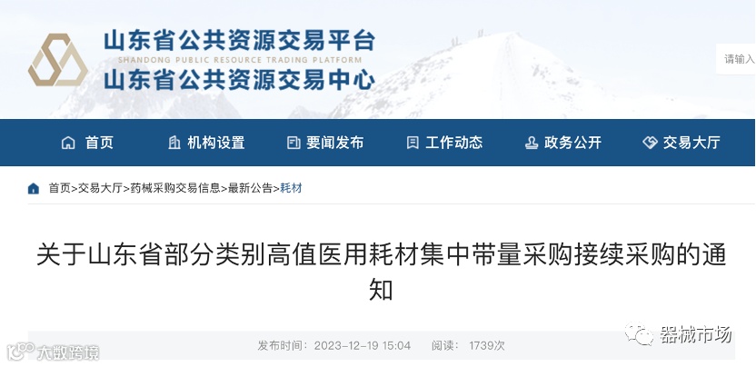 2023年12月19日,山东省公共资源交易中心正式发布《关于山东省部分类别高值医用耗材集中带量采购接续采购的通知》,明确山东将
