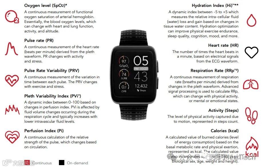 该产品可以提供持续的健康数据,如氧含量、补水指数、脉搏、心脏和呼吸频率等指标。