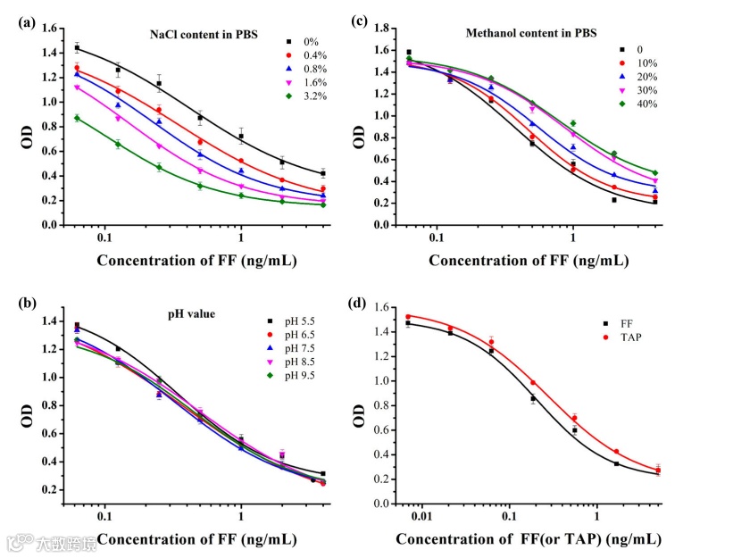 标准曲线对比图(不同条件(NaCl浓度、甲醇浓度、pH值、物种来源)对ELISA标准曲线的影响)