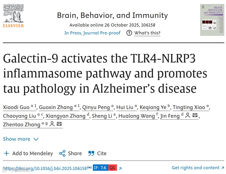 标题:Galectin-9 activates the TLR4-NLRP3 inflammasome pathway and promotes tau pathology in Alzheimer’s disease