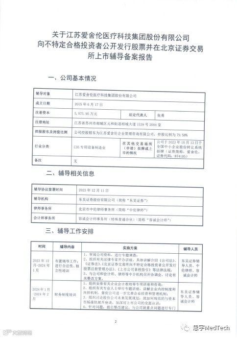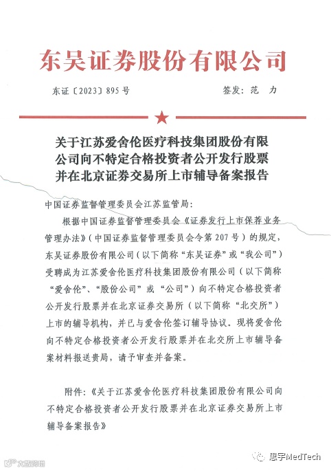 近日,证监会官网披露,江苏爱舍伦医疗科技集团股份有限公司(下文简称:爱舍伦)上市辅导备案,辅导机构为东吴证券。