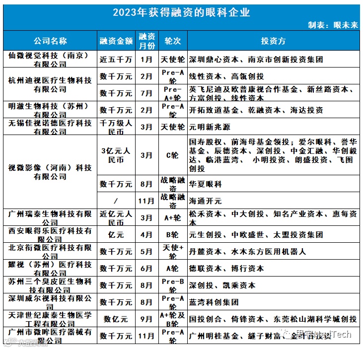 2023年获得融资的13家眼科企业分别是仙微视觉科技(南京)有限公司、杭州迪视医疗生物科技有限公司、明澈生物科技(苏州)有限公司、无锡佳视诺德医疗科技有限公司、视微影像(河南)科技有限公司、广州瑞泰生物科技有限公司、西安眼得乐医疗科技有限公司、北京衔微医疗科技有限公司、耀视(苏州)医疗科技有限公司、苏州三个臭皮匠生物科技有限公司、天津世纪康泰生物医学工程有限公司、广州市微眸医疗器械有限公司。