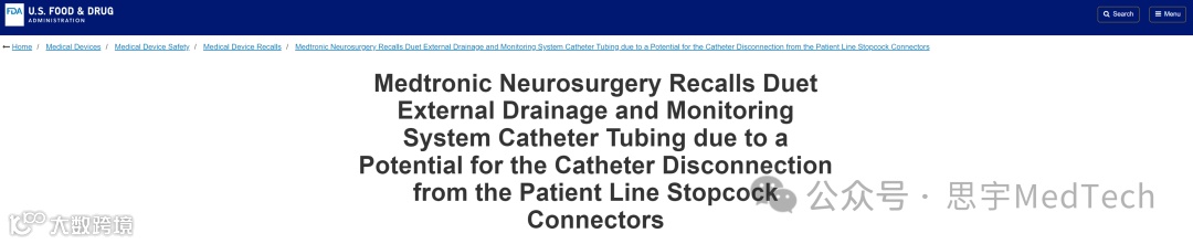 美敦力正在召回Duet系统的外部引流导管,原因是导管可能与患者管道旋塞连接器断开。