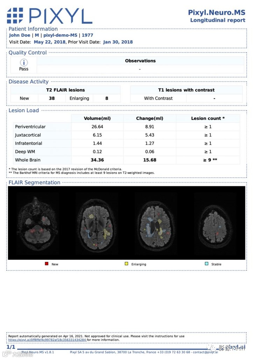 Pixyl.Neuro™是一个用来提高神经系统疾病活动检测水平的解决方案,会自动分析头部MRI影像,加快医生读取MRI的速度,以83%的概率优化多发性硬化症(MS)的MRI检查。