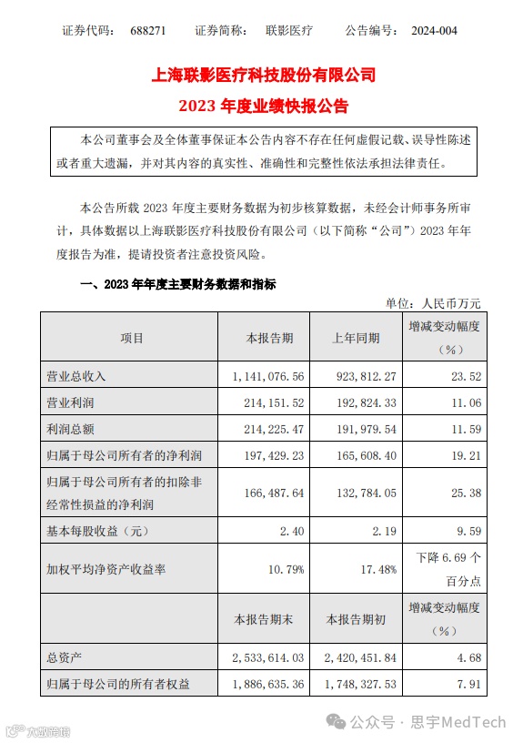 日前,上海联影医疗科技股份有限公司发布了2023年度业绩快报公告。