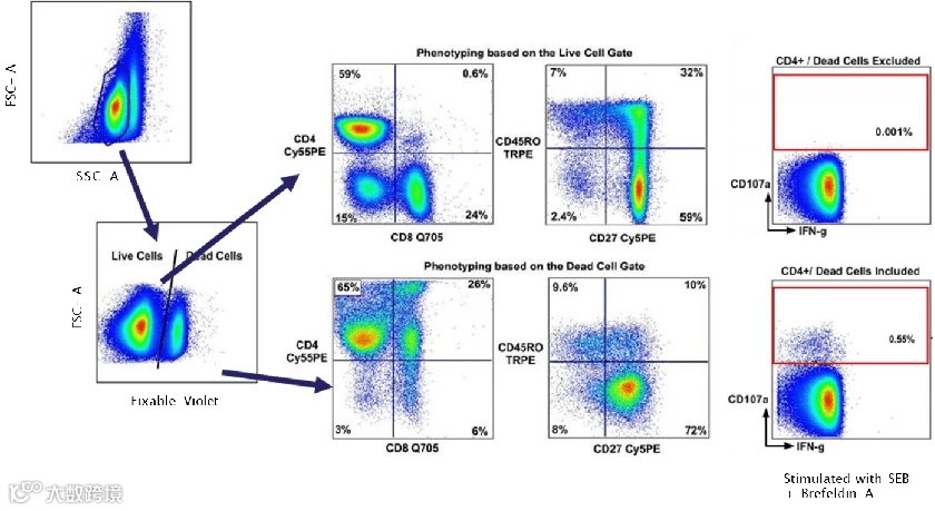 死细胞的破损膜结构可能导致荧光标记物的非特异性结合或信号增强,从而增加背景噪音。。使用死活染料将活细胞与死细胞区分开,并在分析时排除死细胞,是获得清晰、可靠结果的关键步骤。在许多情况下,排除死细胞对数据质量的提升,甚至比设置同型对照更为显著。