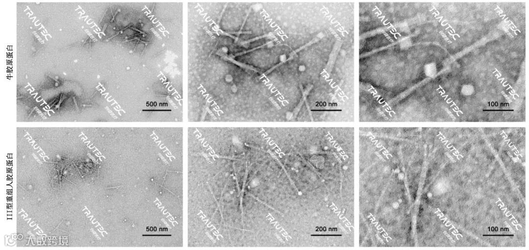 透射电镜下III型重组人胶原蛋白呈现出明暗交替的特征性结构,与《胶原物理与化学》书中的“阴极性染色的胶原纤维显示的特色性暗带谱”完全一致。